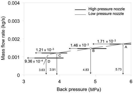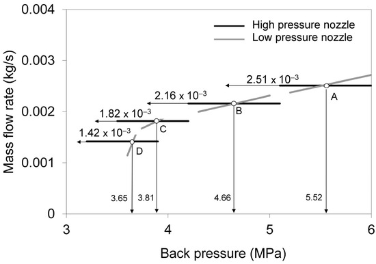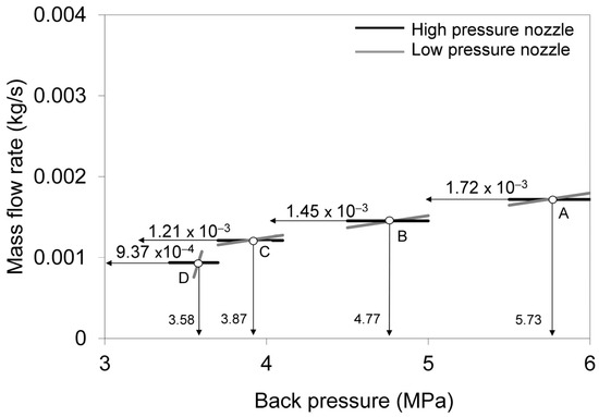 Back pressure values and mass flow rates through high-pressure and low-pressure nozzles for oil mass fraction in the oil separator of 80%. Prediction is performed under the assumption that CO2 does not dissolve in oil. Pressure and temperature in the oil separator and temperature in the back pressure chamber are, respectively: A(12 MPa, 433 K, 353 K), B(10 MPa, 413 K, 343 K), C(8 MPa, 378 K, 325.7 K), and D(6 MPa, 353 K, 313 K).