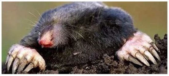 The mole’s claws and toes give it a great advantage in digging, as shown in Figure 1. The front paws of the mole are equipped with curved sharp claws on each toe. The shape and curvature of these claws enable the mole to effectively grasp and dig into the soil. The mole’s front toes have thin pads that increase the gripping force of the claws on the soil. Additionally, the front toes of the mole are flexible and can be curled into a “pincer” shape, allowing for a firm grip on the soil [23]. Utilizing these exceptional claw structures, the mole is capable of efficiently and swiftly engaging in soil excavation activities, enabling the rapid construction of underground burrows. The inherent adaptability of its claw structures to soil excavation endows the mole with significant survival advantages.