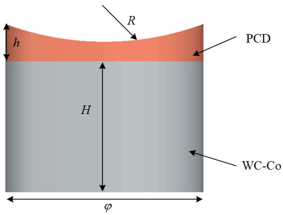 Upon scrutinizing the claw structure of moles, it becomes evident that their claws are not linear but exhibit a curved configuration. This anatomical feature enables the claw tips of moles to produce a “shoveling” effect upon penetrating the ground, thereby applying tensile stress to the rock strata. Due to the inherently lower tensile strength of rocks compared to their compressive strength, they are more susceptible to fracturing under tensile forces, facilitating their disintegration [31]. In light of this phenomenon, the cutting surface of the PDC cutter has been initially conceptualized with a curved architecture, as depicted in Figure 2. The PDC cutter comprises a polycrystalline diamond (PCD) layer paired with a Tungsten Carbide–Cobalt (WC-Co) matrix. The PCD layer possesses a thickness of 3 mm, while the WC-Co layer is 10.6 mm in height. Additionally, the arc radius (R) of the PCD layer is established at 11.5 mm (23/2 mm) and the cutter diameter (φ) measures 16 mm.