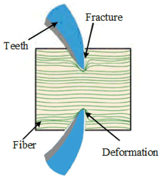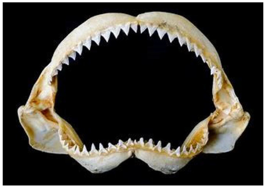 The curved structure of the cutting surface of the cutter can induce tensile stress in the rock, enhancing rock-breaking efficiency. However, this mechanism of rock fragmentation occurs after the cutter is pressed into the rock. To further improve rock-breaking efficiency, the initial process of cutter penetration into the rock needs to be considered. Therefore, a sharper structure needs to be designed to facilitate the cutter’s penetration into the rock. The process by which most animals use their teeth to break down food is shown in Figure 3, where the sharp tooth tip pierces the food, subsequently disrupting the fibers within the food, ultimately causing it to fracture. In this process, the sharp end of teeth reduces the contact area with food, thereby minimizing resistance and facilitating easy penetration [32]. The teeth of sharks are characterized by a serrated structure, with these serrations inclined backward, making it difficult for sharks to release their prey once bitten. To enhance the sharpness of the cutter, the design takes inspiration from the structure of shark teeth, as depicted in Figure 4. In the design process, the structural characteristics of a wavy-shaped cutter are combined, coupling the serrated structure onto the curved cutting surface, as shown in Figure 5. The distance between the tops of adjacent serrated edges is set at 4 mm, and to ensure the strength of the PCD surface, the depth of the serrations is designed to be 0.5 mm [24].