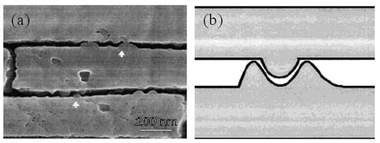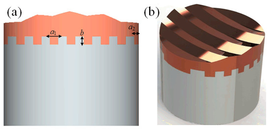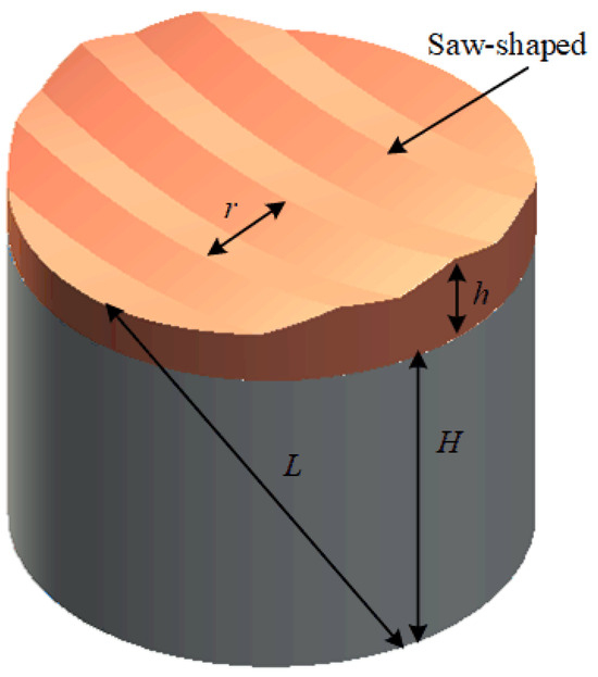 The forces on the cutter are constantly changing during the breaking process, which requires high impact resistance, toughness, strength, and wear resistance [33]. However, the significant material difference between the upper and lower layers of the PDC cutter leads to the occurrence of detachment at the interface during the rock-breaking process. To prevent this phenomenon, it is considered to draw inspiration from the microstructure of materials, as shown in Figure 6. It can be observed that the edges of the two crystals form a “convex–concave interlocking” structure, which generates elastic friction during crystal sliding. Under loading conditions, this structure induces anisotropy, absorbs more energy, and generates toughening mechanisms [34]. Based on the toughening mechanism of the microstructure of biological materials, the interface structure of the cutter is considered to be designed as shown in Figure 7a. In this design, the width (a1) of the columnar structures, except for the edge region, is set at 1 mm, while the height (b) of the columnar structures is set at 1 mm. The final biomimetic PDC cutter structure is depicted in Figure 7b, where the columnar structures in the edge region have a width (a2) of 0.5 mm.