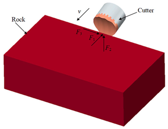 According to Saint-Venant’s principle, the volume of the rock should be 5 to 10 times the volume of the cutter. Therefore, a rock with dimensions of 170 mm × 50 mm × 25 mm was constructed, and the cutter was assembled with the rock for subsequent finite element mesh modeling. The assembled structure is shown in Figure 8, where the cutter breaks the rock in the direction indicated in the figure at a velocity of v. Meanwhile, the cutter experiences reaction forces from the rock, namely tangential force F1, axial force F2, and radial force F3.