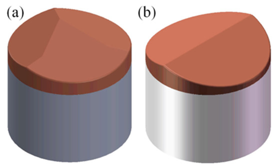 To fully investigate the advantages of bionic PDC cutters for rock breaking, a 16 mm diameter triangular prism cutter and an axe cutter were constructed using SOLIDWORKS2022 software, as shown in Figure 9a,b. The cutter was designed as a bionic PDC cutter with a diameter of 16 mm and an axe cutter with a diameter of 16 mm. The specific parameters of the triangular prism cutter can be found in the literature [15], and specific parameters for axe cutters can be found in the literature [19]. Numerous previous studies and field applications have demonstrated that triangular prism and axe cutters break rock better than conventional cutters; therefore, there is no need to compare the rock-breaking process of bionic and conventional cutters in this study.
