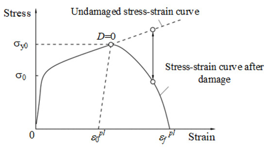 where E is Young’s modulus before rock crushing, E’ is Young’s modulus after rock crushing, ε is strain, σ is stress, and σy0 is the yield stress at rock crushing, at which time the total damage D = 0. When the plastic strain reaches δfpl, the total damage D = 1 and the rock is completely broken, and the stress–strain curve of the rock failure process is shown in Figure 10.