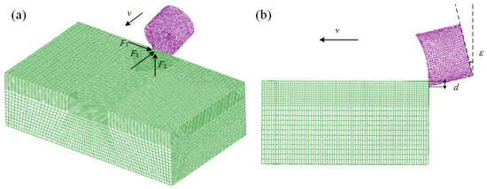 A finite element mesh model of the interaction between the PDC cutter and the rock was constructed in ABAQUS 2023 software, as shown in Figure 11. In this model, the biomimetic PDC cutter was meshed using second-order tetrahedral elements (C3D10M), while the rock was meshed using linear reduced integration hexahedral elements (C3D8R). To ensure computational accuracy and improve efficiency, the mesh was refined at the contact area between the cutter and the rock, with a mesh size of 0.5 mm and a mesh size of 1.5 mm for the remaining areas. The cutting speed (v) was set to 0.3 m/s, the cutting depth (d) was set to 1.5 mm, and the cutter’s back rake angle (ε) was preset to 15°. To ensure convergence of the cutter–rock interaction, a frictional contact relationship between the cutter’s surface and the rock nodes was established in advance. The normal contact was set to be rigid, while the tangential contact was modeled using the penalty method, with a friction coefficient of 0.4 between the two surfaces [40]. The simulated rock material with elastic modulus of 11.54 GPa, Poisson’s ratio of 0.062, friction angle of 38.03°, tensile strength of 4.346 MPa, and compressive strength of 67.548 MPa [13].