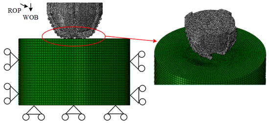 The cutting structure of the drill bit was imported into ABAQUS 2023 software to construct a finite element model of its interaction with the rock, as shown in Figure 13. The rock has a diameter of 500 mm and a height of 300 mm. During the simulation process, the degrees of freedom on the upper surface of the rock were released, while the degrees of freedom on the remaining surfaces were constrained. The wear of the drill bit’s cutting structure was neglected, treating it as a rigid body, and a downward WOB of 20 kN and a constant rotational speed of 30 r/min were applied. To ensure both computational accuracy and efficiency, the mesh was refined at the contact area between the drill bit and the rock with a size of 2.5 mm, while the rest of the mesh had a size of 10 mm. The rock mesh type was set as C3D8R, while the cutting structure of the drill bit had a mesh type of C3D10M. The simulation time was set to 15 s.