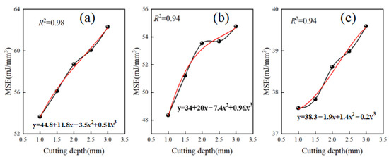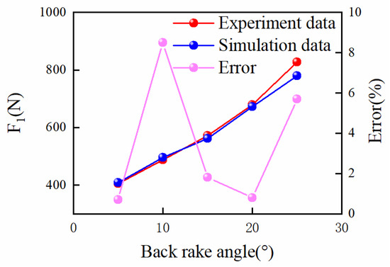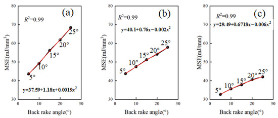 Figure 15 shows the cutting forces and MSE of the triangular prism cutter, axe cutter, and bionic cutter for a back-rake angle of 15°, a depth of cut of 1.5 mm, and a cutting speed of 0.3 m/s.