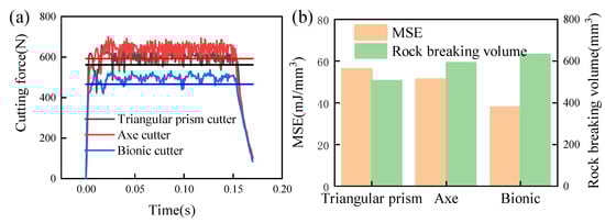 The data in Figure 15b demonstrates that, under the same boundary conditions, the bionic PDC cutter achieves the maximum volume of fractured rock and exhibits the smallest MSE. Compared to the triangular prism and axe cutters, the bionic cutter experiences a reduction in MSE of approximately 32.5% and 35.37%, respectively. This demonstrates the effectiveness of bionic structural design in enhancing the efficiency of the cutter during rock breaking. Moreover, by considering both Figure 15a,b together, it can be observed that the axe cutter achieves higher rock-breaking efficiency compared to the triangular prism cutter, but with weaker stability. This is consistent with our previous research findings [16].