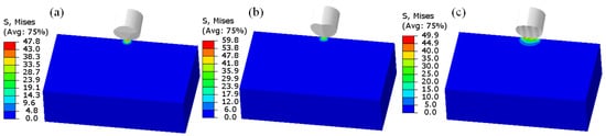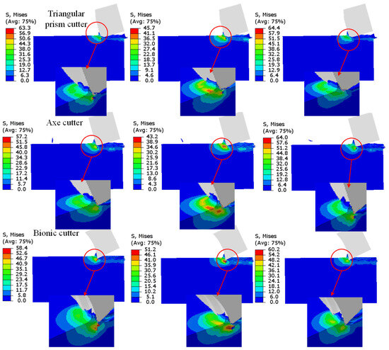 Stress contours at the beginning of the cutter breaking: (a) triangular prism cutter; (b) axe cutter; (c) bionic cutter.
