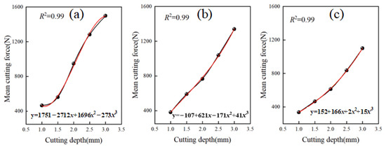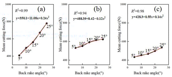 Relationship between the back rake angle and the mean value of cutting force for three types of cutters: (a) triangular prism cutter; (b) axe cutter; (c) bionic cutter.