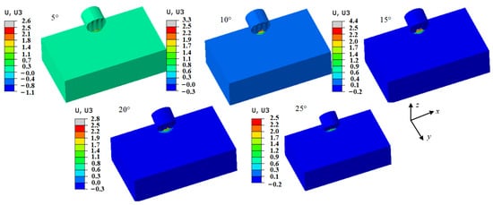 The back rake angle of the cutter determines its angular position on the cutter blade of the drill bit, and a reasonable choice can effectively improve the rock-breaking efficiency of the drill bit [41]. Therefore, simulations were conducted for the three different cutters at various back rake angles (5°, 10°, 15°, 20°, 25°) under a fixed cutting depth of 1.5 mm and cutting speed of 0.3 m/s. Figure 20 shows the relationship between the back rake angle and the average cutting force of three different cutters (Figure 20a corresponds to the triangular prism cutter, Figure 20b corresponds to the axe cutter, and Figure 20c corresponds to the bionic cutter) during the rock fracturing process, where the range of rake angle variation is from 5° to 25°. From Figure 20a–c, it can be observed that, as the back rake angle increases, the cutting force for the triangular prism cutter significantly increases. In contrast, although the cutting forces for the axe and bionic cutters also increase, the trend is not as pronounced as for the triangular prism cutter. This implies that the triangular prism cutter may require a specific back rake angle to achieve high efficiency in the rock-breaking process, while the cutting forces for the axe and bionic cutters are less sensitive to changes in the back rake angle, allowing for a wider range of back rake angle selection in the rock breaking process. It is worth noting that, under the same conditions, with increasing back rake angle, the cutting force for the bionic cutter consistently remains the smallest among the three cutters (except for the case of a 5° back rake angle, where the cutting force for the triangular prism cutter is slightly smaller than that for the bionic cutter). This sufficiently demonstrates that the bionic structural design reduces the resistance of the PDC cutter during the rock-breaking process, thereby improving its wear resistance and lifespan. Additionally, from Figure 20c, it can be observed that the rate of increase in cutting force for the bionic cutter becomes greater when the back rake angle exceeds 15°, indicating that 15° may be its critical back rake angle.