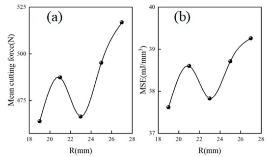 Cutting force and MSE of rock breaking by bionic cutters with different arc radii: (a) mean cutting force; (b) MSE.