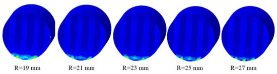 Figure 28 illustrates the distribution of contact stress during the rock-breaking process for cutters with varying arc radii. It is evident from Figure 28 that when the arc radius (R) is 19 mm and 23 mm, the stress distribution area on the cutter surface is the largest. By correlating this information with Figure 27, it becomes apparent that in these two scenarios, both the average cutting forces and the MSE of the cutter are reduced. Consequently, it can be inferred that changes in the arc radius impact the contact position between the bionic cutter and the rock. This, in turn, leads to stress concentration on the cutter surface in specific cases, such as arc radii of 21 mm, 25 mm, and 27 mm. This stress concentration results in localized excessive forces, thereby influencing the stability and efficiency of the rock-breaking process. Consequently, it is imperative to ascertain the optimal arc radius for different formations.
