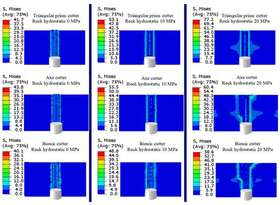 Figure 30 shows the stress distribution maps of rock formations after rock breaking using the three different cutters under varying confining pressures (represented by 0 MPa, 10 MPa, and 20 MPa).