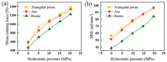 The mean cutting force and MSE change of three cutters under different hydrostatic pressure: (a) Mean cutting force; (b) MSE.