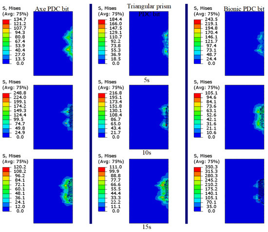 Figure 32 illustrates the stress distribution at different time steps during the rock-breaking process for the three types of drill bits, with stress values given in MPa. The first row corresponds to a simulation time of 5 s, the second row corresponds to 10 s, and the third row corresponds to 15 s. From the figure, it can be observed that, at the same time step, the bionic drill bit achieves the greatest penetration depth, while the triangular prism drill bit achieves the smallest penetration depth. It can also be seen that, under the WOB, both the triangular prism and axe drill bits generate symmetric stress distributions in the rock, while the bionic drill bit generates a relatively asymmetric stress distribution, indicating a stronger penetration ability. This asymmetry may affect the efficiency of the drill bit in the rock-breaking process, thus resulting in higher rock-breaking efficiency. The reason for this is that the asymmetric stress generation indicates that the drill bit is more capable of transferring energy or stress to one side during the rock fracturing process, making the rock on that side more prone to stress concentration and fracturing, thereby enhancing rock fracturing efficiency [44].