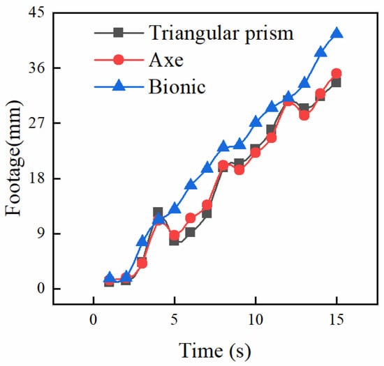 Figure 17 displays the cross-sectional stress contours, quantified in megapascals (MPa), for the three different cutters during the rock-breaking process. It is discernible that, although the overall rock-breaking mechanisms of the three cutters are broadly similar—characterized by the generation of high stress upon initial rock contact, followed by the interconnection of high-stress regions culminating in rock removal—the bionic cutter uniquely exhibits a more pronounced stress concentration at the contact point, especially notable at the rock’s curved tip. This distinct feature of the bionic cutter underscores its enhanced efficiency in stress application, compared to the triangular prism and axe cutters, at the critical moment of initial contact with the rock. Therefore, during the rock-breaking process, the bionic cutter is more likely to reach the rock’s fracture limit, resulting in the lowest cutting force and the most efficient utilization of force. This is because, during the rock fracturing process, the damage to the rock depends on the stress concentration area where the cutter acts on the rock. In other words, when a stress concentration area is formed in the rock, the higher the stress value in that area, the more likely it is to reach its own stress yield limit and undergo damage. Therefore, under the same conditions, the use of bionic cutters is more likely to cause damage to the rock and remove rock chips, resulting in lower rock fracturing resistance, lower energy consumption, and higher efficiency. This point is also supported by Figure 17. Additionally, the axe cutter generates larger volumes of rock debris during the rock-breaking process, while the other two cutters do not exhibit this phenomenon. This indicates that the axe cutter breaks the rock into larger fragments, consuming more energy and resulting in lower rock-breaking efficiency.