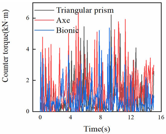 Furthermore, the torsional resistance also reflects the “stick-slip” phenomenon during the rock-breaking process. The maximum and minimum torsional resistance values for the triangular prism cutter are 6.2 kN·m and 2.78 × 10−12 kN·m, respectively. For the axe cutter, the maximum and minimum torsional resistance values are 6.38 kN·m and 8.75 × 10−14 kN·m, respectively. The bionic cutter exhibits maximum and minimum torsional resistance values of 5.38 kN·m and 7.87 × 10−12 kN·m, respectively. It can be observed that the bionic cutter exhibits the smallest difference between the maximum and minimum torsional resistance values, indicating a lower torque requirement during the drilling process and a lower probability of experiencing the “stick-slip” phenomenon.