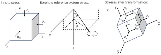 For any trajectory hole, the in-situ stress should be transferred from the geodetic coordinate system to the borehole rectangular coordinate system, and the conversion equation is shown in Equation (1):
