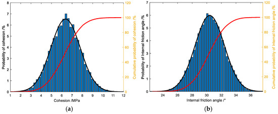 Distribution characteristics of input parameters: (a) cohesion and (b) internal friction angle.
