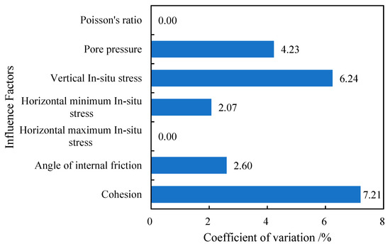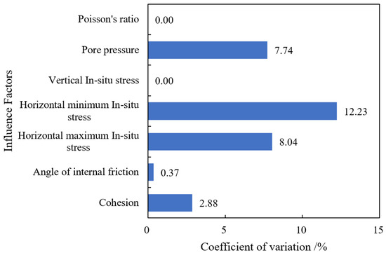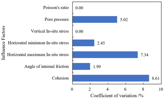 The influence of the input parameters on the vertical borehole collapse pressure was analyzed. The variation coefficient of the lower limit of the safe drilling fluid density output according to the borehole stability and reliability evaluation model is shown in Figure 4. Since the borehole is a vertical well and parallel to the vertical in situ stress, the borehole collapse pressure has nothing to do with the vertical in situ stress. The influence of other factors on borehole stability was analyzed. According to the coefficient of variation, the most influential factors on the borehole instability of the vertical well are in the order of cohesion > maximum horizontal in situ stress > pore pressure > minimum horizontal in situ stress > angle of internal friction > Poisson’s ratio.