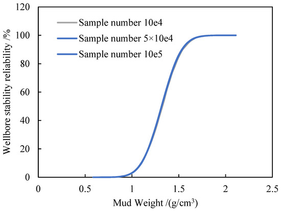 Firstly, the influence of sampling times on borehole instability risk was studied, and the results were obtained when the sampling times were 10,000, 50,000 and 10,000; the borehole collapse and instability risk of the vertical well is shown in Figure 8. As can be seen from Figure 8, when the sampling times exceed 10,000, the borehole stability reliability curves basically coincide. To save calculation time, the sampling times in subsequent calculations were set to be 10,000 times.