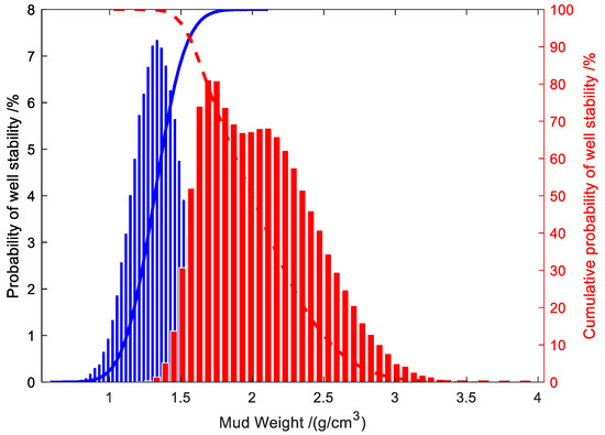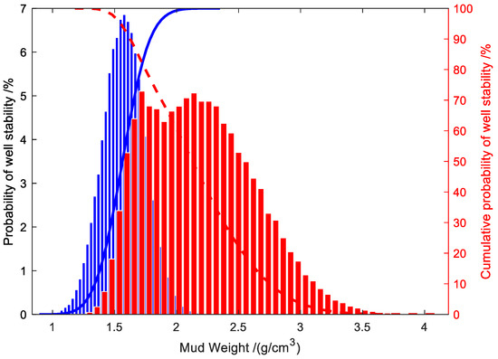 The rule of borehole instability in the vertical well under multi-parameter uncertainty is shown in Figure 9. The blue bars in the chart show the probability density to prevent borehole collapse and instability in the vertical well under different drilling fluid densities. The red bars in the chart show the probability density to prevent vertical borehole breakout and instability under different drilling fluid densities. The blue and red curves show the cumulative probability to prevent borehole collapse and fracture instability (also known as borehole stability reliability) under different drilling fluid densities. It can be seen from the figure that the probability density to prevent collapse and the probability density to prevent fracture overlap with each other. The larger the overlap area, the lower the probability of borehole stability. At the intersection of the blue curve and the red curve, the drilling fluid density is 1.61 g/cm3, and the probability that the borehole wall will not collapse or break is 95.895%. The stability and reliability of the borehole wall are the highest at this drilling fluid density, but the safety density window is extremely narrow. Considering construction measures such as the start and stop of drilling fluid pumps and the lifting and dropping of drilling tools, it is difficult to maintain the equivalent drilling fluid density at 1.61 g/cm3. In practice, the equivalent drilling fluid density has a certain window, and the larger the window of the equivalent drilling fluid density that the borehole wall can withstand, the better the stability of the borehole wall. Similarly, by controlling the equivalent drilling fluid density window, the reliability of borehole stability can be controlled within a certain range, and the higher the reliability of borehole stability, the better. When the borehole stability reliability is 90% (that is, the cumulative probability of no borehole collapse or fracture and instability is 90%), the equivalent drilling fluid density window is 1.55~1.67 g/cm3, indicating that the drilling fluid density variation range is only 0.16 g/cm3. When the borehole stability reliability is reduced to 80%, the equivalent drilling fluid density window changes to 1.46~1.79 g/cm3, and the safe drilling fluid density range is 0.33 g/cm3. When the borehole stability reliability is 70%, the equivalent drilling fluid density window is 1.43~1.85 g/cm3, and the safe drilling fluid density range is 0.42 g/cm3. When the stability reliability of the borehole wall is further reduced to 60%, the safe drilling fluid density ranges from 1.36 g/cm3 to 1.97 g/cm3, and the safe drilling fluid density range is 0.61 g/cm3. With an increase in drilling fluid density window, the risk of borehole instability gradually increases.