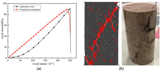 In this study, sandstone samples of standard dimensions (diameter 50 mm, height 100 mm) were utilized as prototypes, and a particle flow model was constructed using a parallel bonding approach. Prior to the model calculation, it was essential to calibrate the parameters based on the macroscopic mechanical characteristics of the rock through an iterative trial and error method. The contact modulus, parallel bond modulus, and microscopic stiffness ratio of the numerical model were adjusted repeatedly until the simulated stress-strain curve and rock failure mode closely matched those obtained from laboratory tests. Following parameter calibration, a comparison between the stress-strain curve obtained from uniaxial compression testing and numerical simulation was conducted alongside fracture modes (Figure 3). The mesoscopic parameters employed in this model are presented in Table 1.