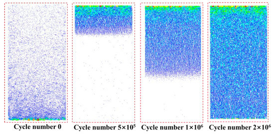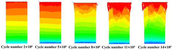 The evolution law of the rock displacement distribution cloud map is illustrated in Figure 4. Under the influence of high-frequency ultrasonic vibration, the internal displacement of the rock exhibits a distinct stratification effect, with a gradual decay in displacement values from the load surface to the bottom of the rock. From a statistical perspective, both maximum and minimum displacements vary with cycle numbers, as depicted in the Figure 5. Once reaching a maximum displacement value of 5.0199 × 10−3, it reaches a plateau indicating stability without further increase. A similar trend can be observed for minimum displacements, where they cease to increase upon reaching an extreme point at 7.3360 × 10−5. The maximum displacement area of the rock is consistently located in close proximity to the excitation surface. During the initial stage of ultrasonic vibration excitation, the internal deformation of the rock exhibits an approximate linear increase, indicating elastic deformation within the rock without any concurrent damage. Once the displacement generated in the rock reaches its limit deformation value, particle bonds within the interval experiencing maximum deformation are more prone to breakage and subsequent cracking occurs.