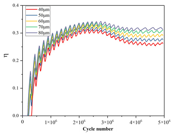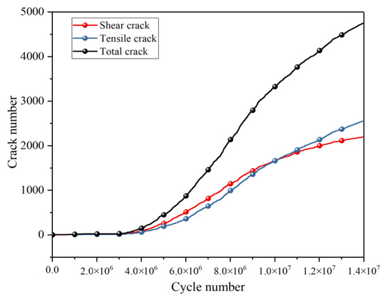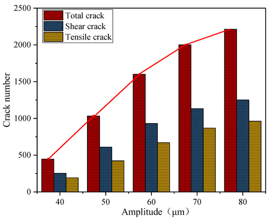 The evolution of crack formation and propagation in the rock under varying amplitudes is illustrated in Figure 14 and Figure 15. The amplification of amplitude expedites the initiation and progression of cracks. Under the same number of cycle steps, when the amplitude increases from 40 μm to 80 μm, the total number of cracks generated increases by 494.44%. The cumulative shear and tensile cracks in the rock are 1251 and 962, respectively, which is five times higher than the number of shear and tensile cracks generated at a load amplitude of 40 μm. The difference between the numbers of shear and tensile cracks increased from 63 to 298, representing a growth rate of 373.02%.