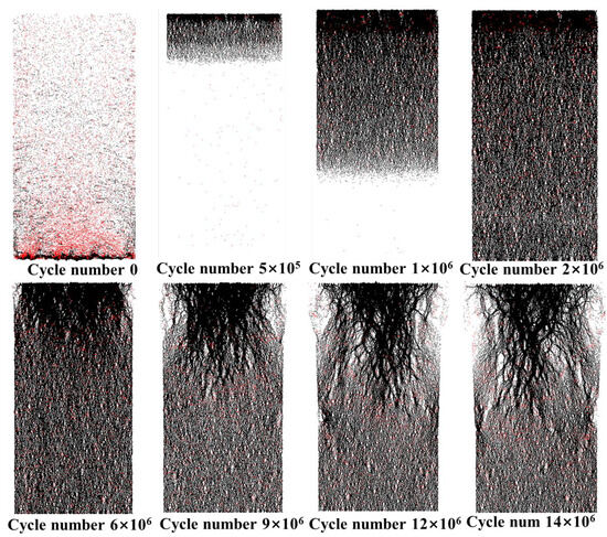 The distribution of rock internal force chain field at different vibration stages is illustrated in Figure 9, where compressive stress is represented by black and tensile stress is represented by red. Initially, both tensile and compressive stresses are evenly distributed within the rock. However, under the influence of vibration load, this initial equilibrium is disrupted, resulting in the generation of a stress concentration zone dominated by compressive stress below the load surface that extends downwards. The intensification of rock fracture leads to a more pronounced development of compressive stress chains within the rock, resulting in an increased extension range of force chains and predominantly compressive internal stresses.