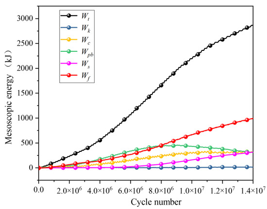 The total strain energy comprises the parallel bond strain energy (Wpb) and particle strain energy (Wc), while the total dissipative energy plasticity encompasses deformation energy (Ws) and frictional energy (Wf). The calculation equation for each type of energy is presented as follows: