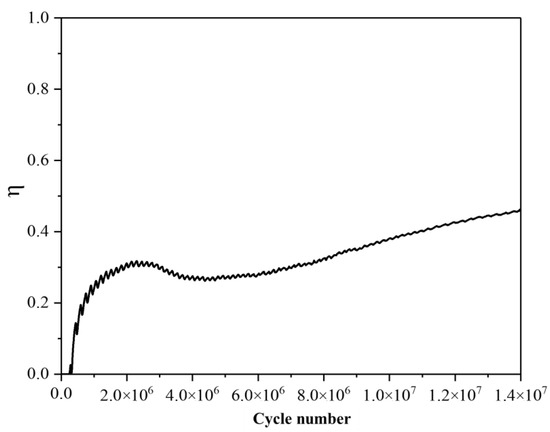 The energy dissipation coefficient represents the ratio of the partial energy released during rock fracture to the total input energy, thereby reflecting the efficiency of energy utilization under vibrational loading conditions. A higher coefficient indicates a greater amount of energy allocated towards rock fracturing. The dynamic evolution of the energy dissipation coefficient is illustrated in Figure 11, Due to the sinusoidal variation characteristics of the vibration load, the dissipation coefficient curve exhibits local fluctuations. During the initial stage of vibration, dissipative energy emerges as cracks initiate in the rock, leading to an upward trend in the energy dissipation ratio. However, due to a lower energy dissipation rate compared to the strain energy storage rate, the growth rate of the dissipation ratio gradually slows down and even exhibits a downward trend after reaching its peak value. As more cracks develop, eventually surpassing the energy storage rate, the curve of the energy dissipation ratio begins to rise continuously.