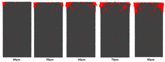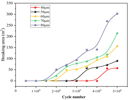 The rock breakage under ultrasonic high-frequency vibration loads with amplitudes of 40 μm, 50 μm, 60 μm, 70 μm, and 80 μm respectively for the same number of cycles is illustrated in Figure 12. It can be observed that increasing the amplitude expands the range of rock failure and generates more fragments. To quantitatively describe the degree of damage to rocks under different amplitudes, a fish language was developed to record real-time fragmentation levels. The dynamic evolution of rock fragmentation volume under different amplitudes was obtained over 5,000,000 cycles as depicted in the Figure 13. Clearly, as the amplitude increases, the evolution curve of rock fragmentation area gradually steepens indicating an accelerated rate of rock failure with larger amplitudes leading to earlier occurrence of fragmentation. Under an equal number of cycles, when increasing from an amplitude of 40 μm to 80 μm, there is a significant increase in overall crushing area from 57.3 mm2 to 303.5 mm2 representing a growth rate of approximately 429.67%.