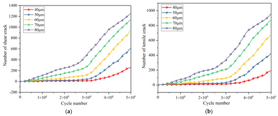 (a) The number of shear cracks varies with different amplitudes; (b) The number of tensile cracks varies with different amplitudes.