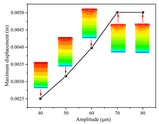 The rock deformation field under different amplitudes after the same number of cycles is illustrated in Figure 16. Altering the amplitude does not affect the ultimate displacement value of the rock. Prior to reaching the maximum deformation capacity, higher amplitudes result in greater displacements within the rock induced by vibrational loading for a given number of cycles. Once the maximum displacement in the rock reaches its limit deformation value, increasing the amplitude expands the range of maximum deformation. The aforementioned analysis demonstrates that the amplification of amplitude during ultrasonic vibration loading can expedite the attainment of rock’s ultimate deformation and broaden its range, thereby inferring that an increase in amplitude can accelerate the speed and extend the scope of rock fracture.