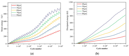 (a) Strain energy evolution under different amplitudes; (b) Evolution of dissipated energy at different amplitudes.