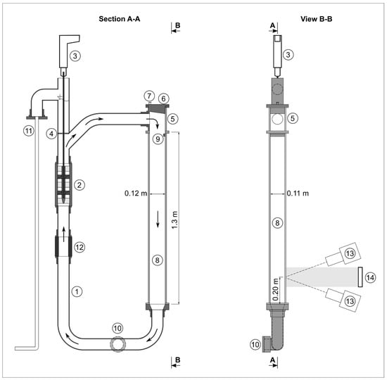 Recirculating vertical cell with measuring equipment. Legend: 1. PVC pipe, 2. two propellers fixed on shaft, 3. electric motor, 4. horizontal sieve, 5. inlet pipe fitting, 6. hatch, 7. air release valve, 8. plexiglass pipe, 9. flow-directing sill, 10. Invert U-bend with hatch, 11. overflow pipe, 12. flow meter, 13. high-speed cameras, 14. lighting system.