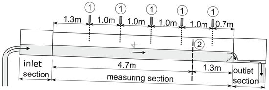 To evaluate the uniformity of the flow essential for the experiments, ultrasonic level meters are employed to measure the water level at five points. In cases of non-uniform flow, adjustments are made to controllable parameters, such as the flow rate, flume slope, or the height of the sluice gate at the flume outlet (Figure 2).