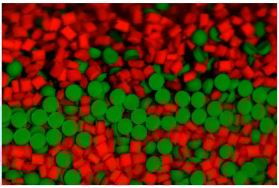 For the experiments in the vertical cell, three fractions of nearly spherical plastic particles were employed. These fractions were distinguished by their color (see Figure 4), and the particles of the chosen fraction had a very similar size and density to prevent segregation in the vertical flow (Table 1). Additionally, the particles were designed to be nearly neutrally buoyant, reducing the slip caused by differences in local velocities between particles and water in the vertical flow of the mixture.