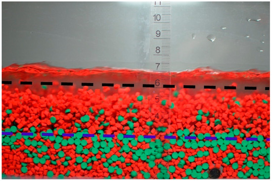 When transported in the water flow through the flume, particles from the two fractions exhibited a tendency to stratify and form a transport layer above a stationary granular bed that occupies the bottom of the flume. Figure 6 presents a photograph capturing the flow in the flume, taken through a transparent sidewall. In the photo, the dashed blue line delineates the visually observed top of the stationary bed, while the parallel black line marks the top of the transport layer beneath the water surface; both are visible in the image. The ruler affixed to the sidewall, with zero at the bottom of the flume, indicates elevations of the interfaces and the water surface. While particles from both fractions were present in both the bed and the transport layer, a greater number of coarser fraction particles (green particles) tended to occupy the bed compared to the finer fraction particles (red particles). Conversely, in the transport layer, the proportions were reversed.