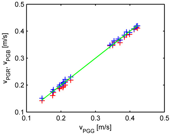 Cross-section-averaged velocities of particles of different fractions in the vertical measuring section of the recirculating cell. Red + = measured particle velocity of PGR (vPGR); blue + = measured particle velocity of PGB (vPGB); green line = measured particle velocity of PGG (vPGG).