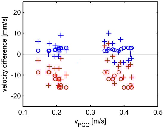 Differences in the cross-section-averaged velocities of the particles. Red o = measured difference in the particle velocities of fractions PGR and PGG (vPGR − vPGG); red + = calculated difference in the hindered settling velocity of fractions PGR and PGG; blue o = measured difference in the particle velocities of fractions PGB and PGG (vPGB − vPGG); blue + = calculated difference in the hindered settling velocity of fractions PGB and PGG.