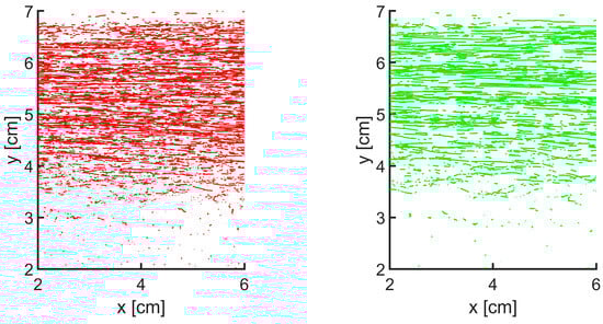 Particle trajectories derived from 250 successive frames using the Voronoi-based particle tracking algorithm for particles of two fractions in the bimodal granular flow in the tilting flume (test no. 1). Left: SUN25 particles; right: FA30 particles.