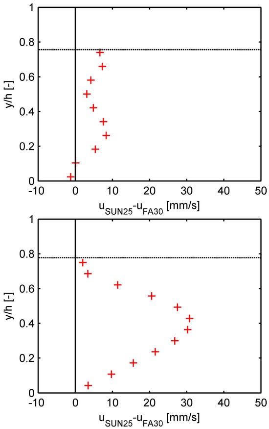 Distribution of local slip velocity between fractions SUN25 and FA30 across the transport layer in the tilting flume. Upper plot: test no. 1, lower plot: test no. 2. Legend: red marker—experimental uSUN25 − uFA30, horizontal dash line—visually estimated top of the transport layer.