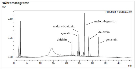 HPLC chromatogram of isoflavones in SMB100 after 10 weeks of storage. The retention time of analytes: daidzin 22.1 min, genistin 24.5 min, malonyl-daidzin 24.9 min, malonyl-genistin 27.0 min, daidzein 29.5 min and genistein 32.3 min.