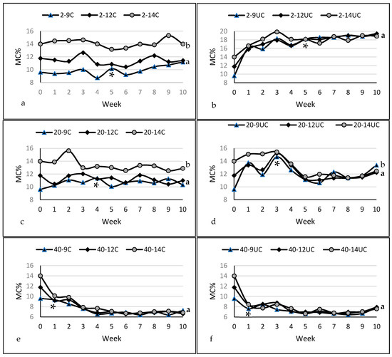 The mean (n = 3) changes in percentage moisture content (MC%) over 10 weeks of storage of SMB flour. Different connecting letters show significantly (p < 0.05) different moisture contents after 10 weeks of storage, while lines marked with an asterisk (*) show when similarity (p > 0.05) in MC was reached. Initial moisture contents of 9%, 12% and 14% were stored both covered (C) and uncovered (UC) at temperatures of 2 °C ((a) 2 °C covered, 2-9C, 2-12C, 2-14C and (b) 2 °C uncovered, 2-9UC, 2-12UC, 2-14UC), 20 °C ((c) 20 °C covered 20-9C, 20-12C, 20-14C and (d) 20 °C uncovered 20-9UC, 20-12UC, 20-14UC) and 40 °C ((e) 40 °C covered 40-9C, 40-12C, 40-14C and (f) 40 °C uncovered 40-9UC, 40-12UC, 40-14UC).