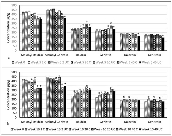 Significant reductions in malonyl isoflavones were observed at week 5 for samples stored at 40 °C, when compared to the control, with conversions of 24.2% (C) and 23.2% (UC) for malonyl daidzin and 25.3% (C) and 22.0% (UC) for malonyl genistin. Samples stored at 20 °C UC were also significantly reduced to a lesser degree, with a 1.65% and 1.1% reduction in malonyl daidzin and malonyl genistin. The high content of malonyl isoflavones has been reported by Jackson et al. [50] for SMB, while β-glucosides were also found to dominate by Jankowiak [51].