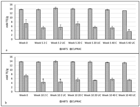 Antioxidant capacity of flour with an initial moisture content of 12%, stored for 5 weeks (a) and 10 weeks (b), compared to week 0 as control, stored at 2 °C, 20 °C and 40 °C, covered (C) and uncovered (UC). Data are mean (n = 3) ± standard deviation, and * shows a significant (p < 0.05) difference to the initial content for each antioxidant assay.