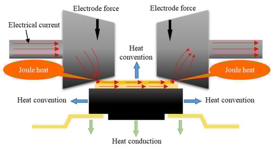 The parallel seam welding process is a typical three-dimensional transient heat conduction problem of internal heat sources. The governing equation for the transient temperature field distribution, which involves electrical resistance heat, can be described as [22]: